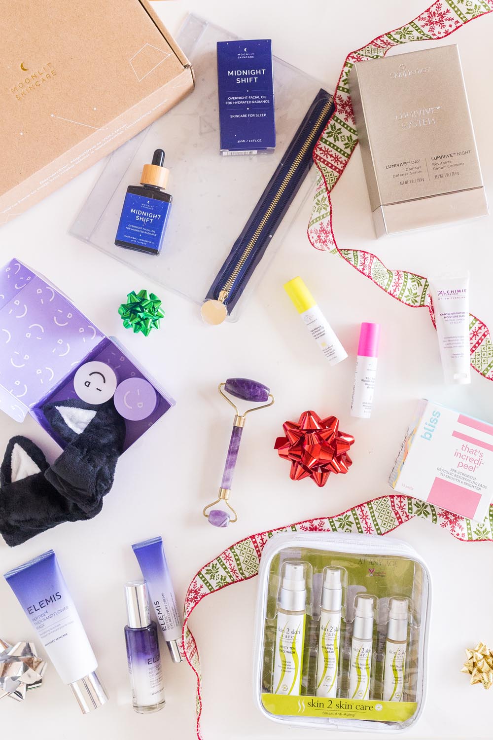 1. L’ Occitane Delicious Almond Collection, $74 Want to give the gift of luxury and the softest skin ever? Look no further than this set from L’Occitane! The almond-scented products are some of my favorites. If you have to pick something specific to give, I can’t recommend the this product enough. Even Dave is a fan! (And we all know he’s hard to please.) 2. Skin2Skin Travel Set, $39 If you’re shopping for a travel girl or guy, then they’ll appreciate this gift set! All zipped up in a clear travel case, perfect for their next flight! 3. Amethyst Facial Roller, $35 The top beauty gift of 2018? My guess would be a facial roller! This was a hot item all year long for beauty lovers of all walks of life, and I think anyone would appreciate this pretty amethyst version! Cool to the touch, the roller does a great job at depuffing and distributing skincare products. 4. Moonlit Constellation Skincare Set, $66 I love trying new brands, and was thrilled to be introduced to Moonlit Skincare at a recent event here in Seattle. This brand encourages sleep and wellness through 8 hours of sleep nightly to allow their skincare product to work its magic. Lavender oils infused into the product encourage a calm and restful night’s sleep, too! 5. SkinMedica Lumivive System, $150 Looking to give the gift of skincare results? SkinMedica is a Dermatologist-developed, award-winning skincare line. The Lumivive System provides your gift recipient with two power players for day and night.