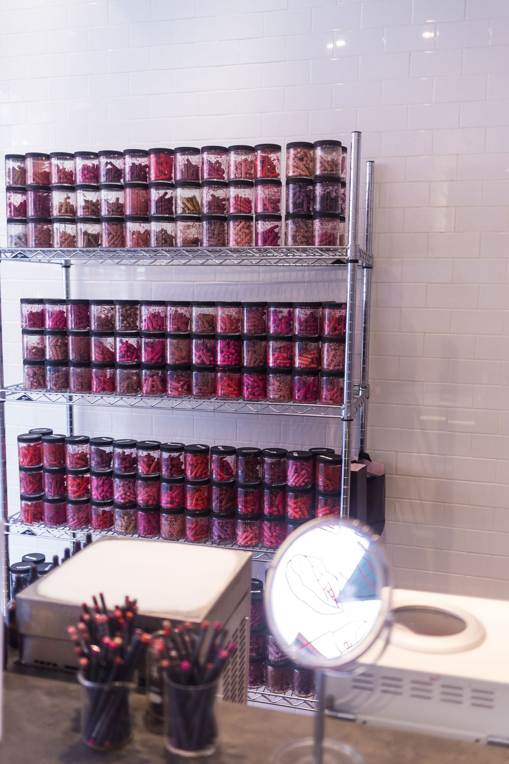 While our artists mixed our lipstick pigments together to create our lipstick, Rebecca and I tested out our scent options. We also were able to mix scents. I opted for a cherry vanilla for my oxblood color, and a coconut vanilla for my everyday nude color. Once we had selected each scent, it was added to the mixture, then they placed it into lipstick forms. Then, the lipsticks were put into a special device where they were heated and cooled to hold their form.