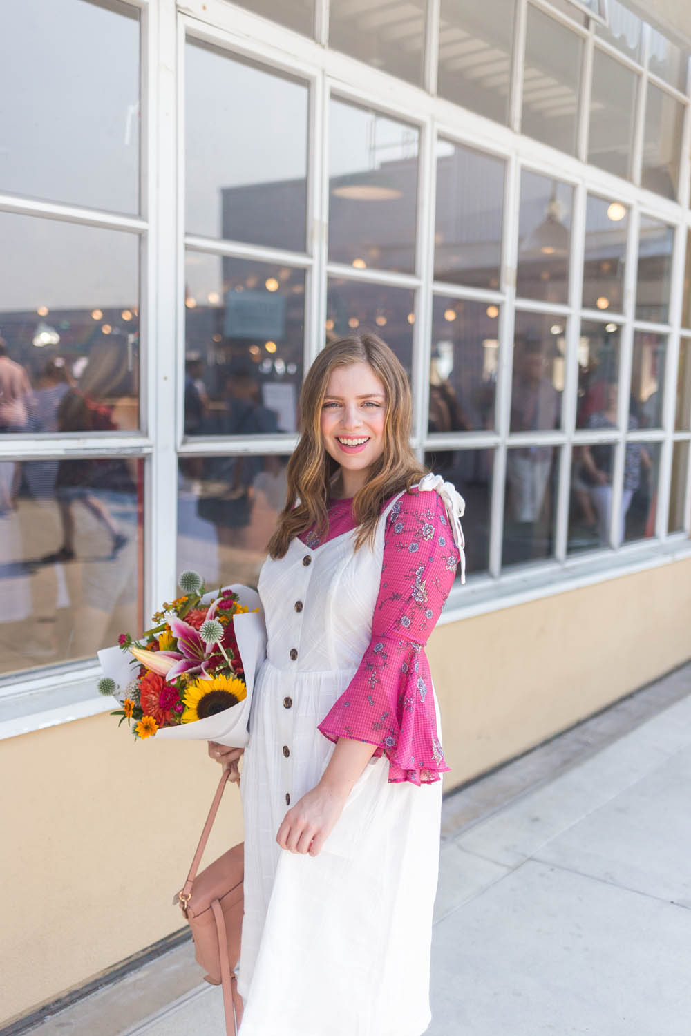 For the occasion, I couldn’t resist putting together a fun, casual summer outfit featuring some of the cutest summer pieces from Kohl’s. The LC Lauren Conrad line is a long-time favorite of mine and was the first place I looked when I was putting together this look. Conrad’s line for summer didn’t disappoint – this trendy button front dress was the first piece I picked out, and I knew it would look perfect layered with this pretty floral bell sleeve blouse!