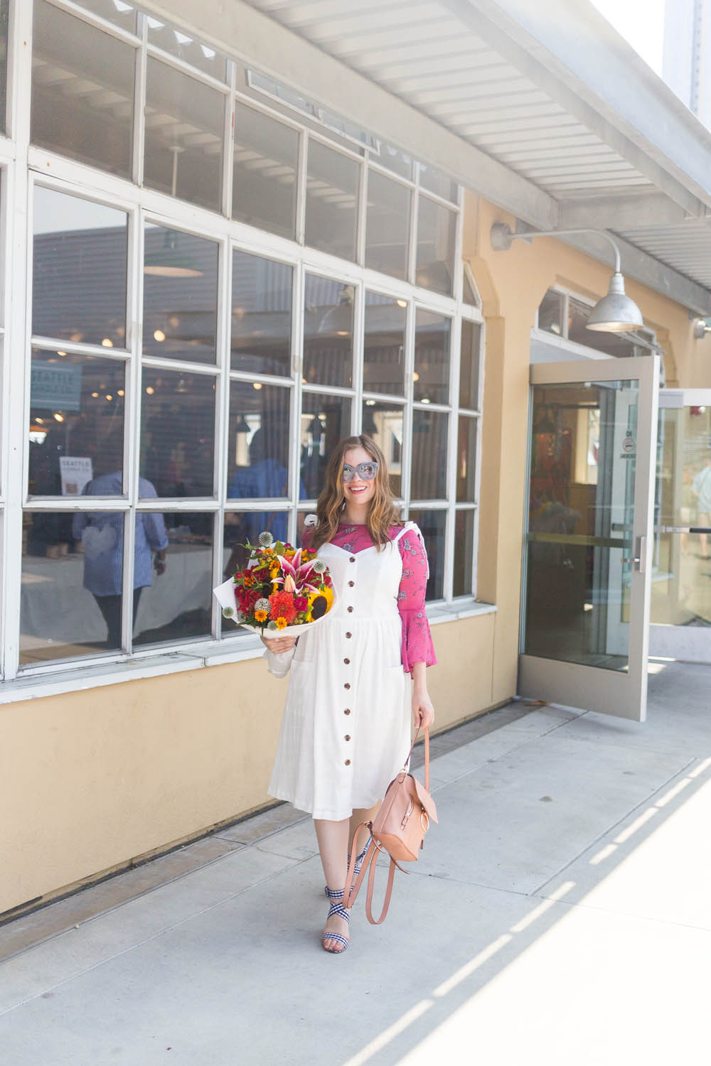 A pair of gingham heels, a pretty pink stone ring, and a convertible backpack that can be carried by the handle or worn as a backpack were the perfect accessories for this outfit for a day at the Market. And for that ubiquitous Seattle sun, I popped on a cute pair of fashion sunglasses. I love the retro vibe!