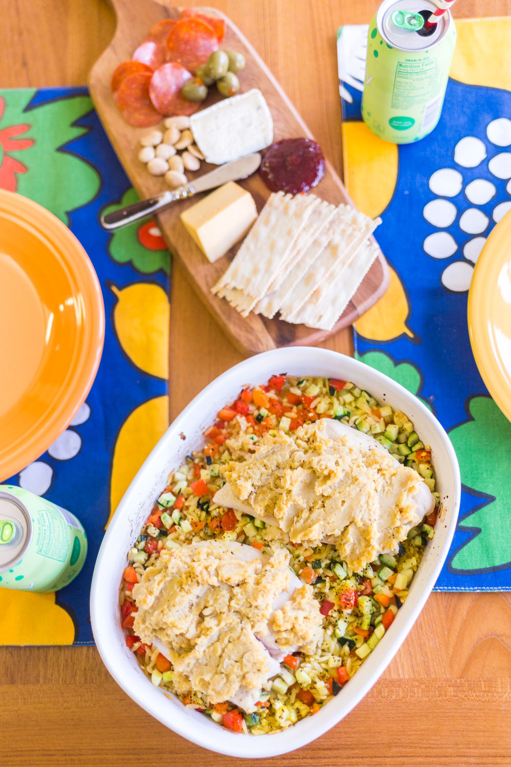 Hummus Baked Chicken with Feta and Vegetable Orzo is a delicious and healthy home cooked meal! Smashed chickpeas, lemon, and olive oil smother boneless skinless chicken breasts which are baked on a flavorful bed of orzo with bell peppers and zucchini and then topped with feta cheese. So delicious!