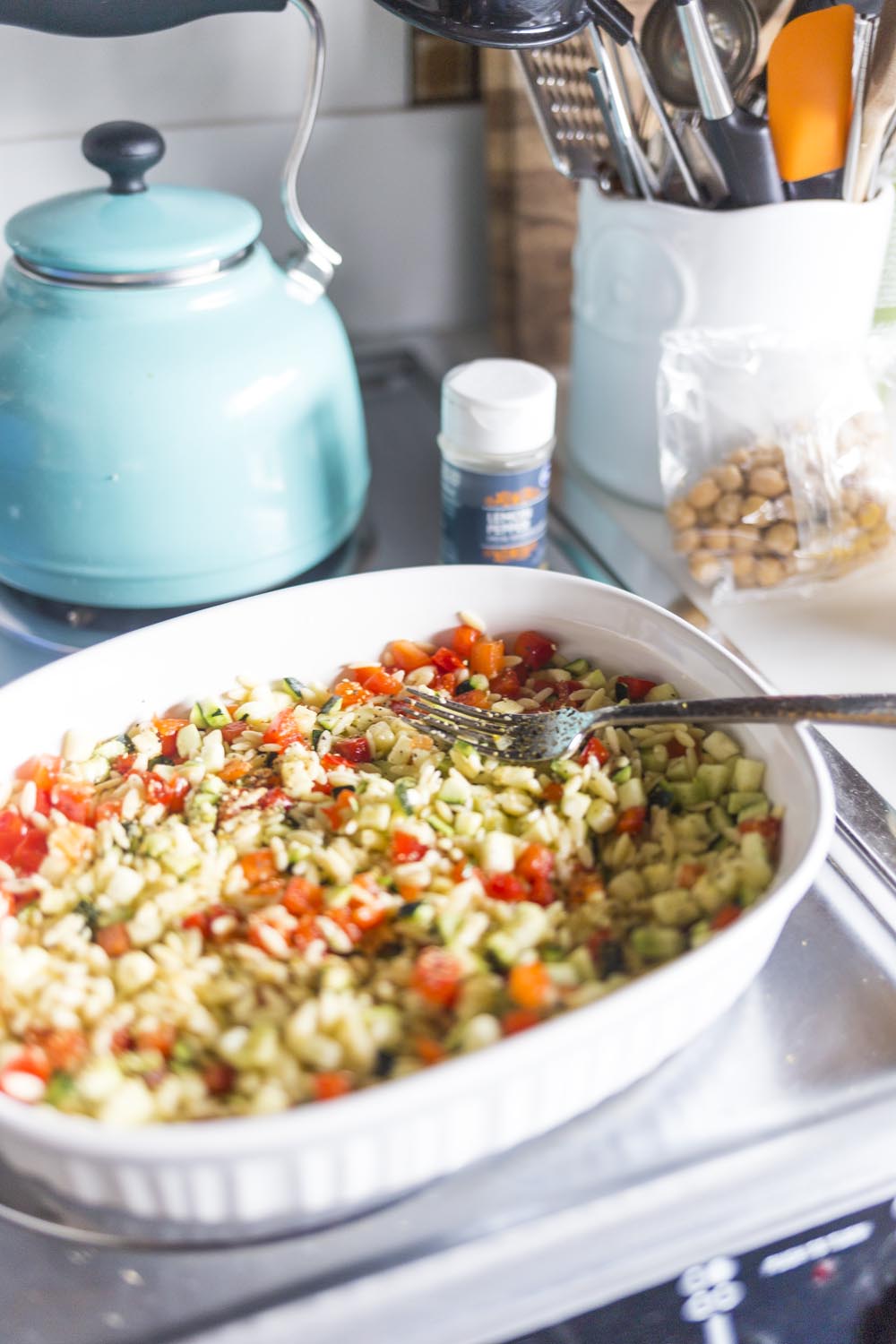 Cut lemon in half. In a baking dish, add orzo, juice from one half of lemon, 1 TBSP olive oil, red peppers, and zucchini. Season with salt and pepper, and stir to combine.