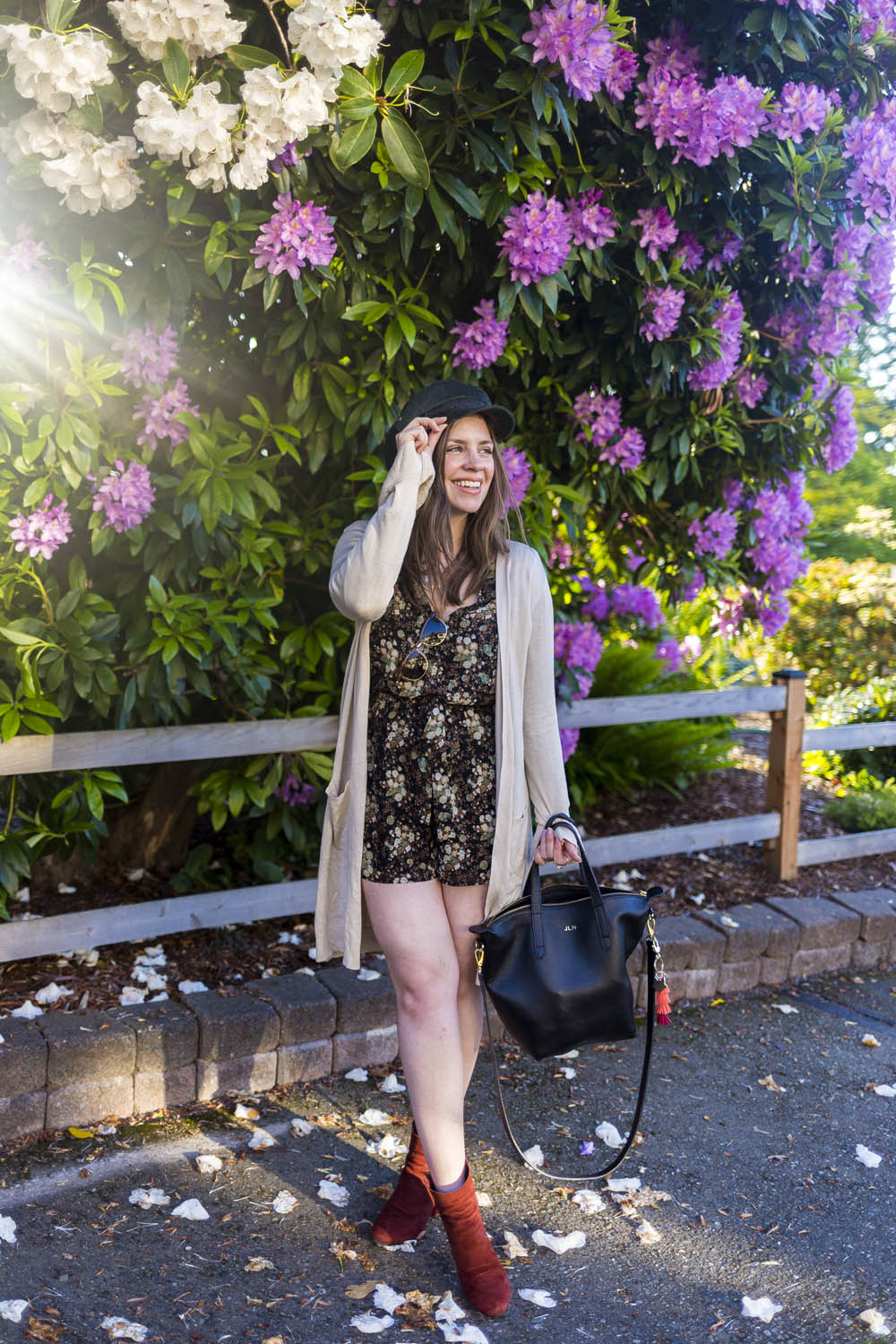 I love wearing rompers, but sometimes it’s just not practical to have bare legs all day long, especially if I’m out and about! So what’s a girl to do? Add a versatile sweater, of course! This Duster Cardigan with Ruffle Cuff in Beige is the perfect length to keep me warm (but not too warm, it is pretty lightweight!) and goes perfectly with the tones of this outfit!