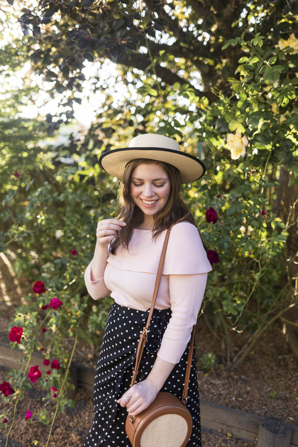 You can wear it as high or low on your arms as you wish. I like the flirty look of just barely showing off my shoulders, and the pink tone adds to the femininity of this piece. I complimented the pretty pink with one of my favorite prints of the moment: polka dots! This pretty ruffle sweater is also available in black and white.