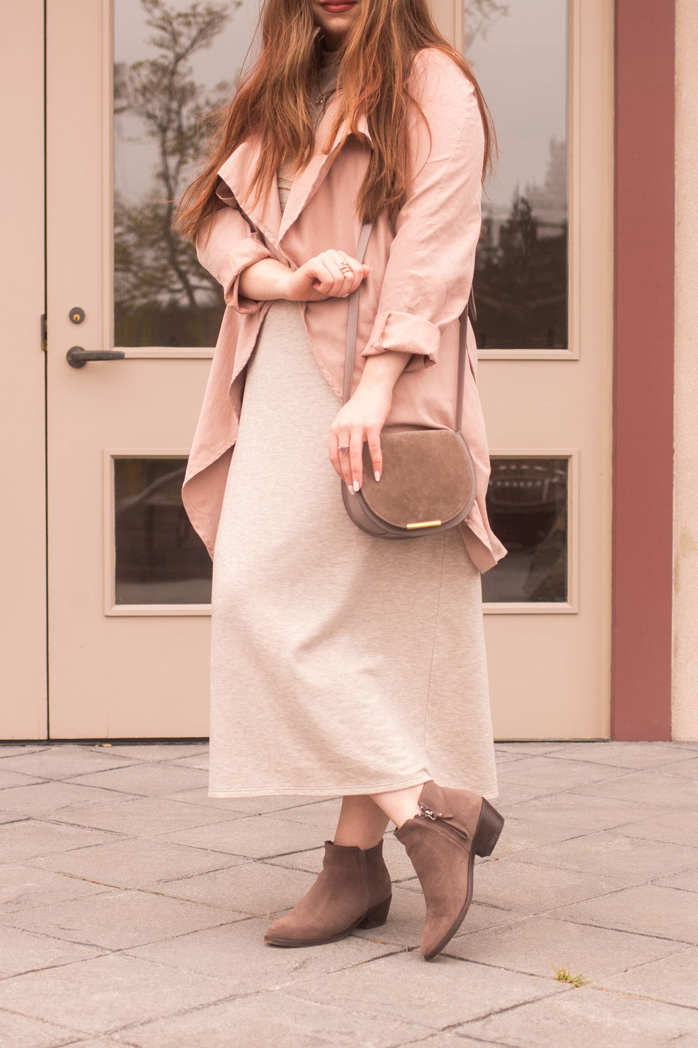 My favorite way to tackle this problem is through a layering system. Knee length dresses with lightweight blazers or jackets, maxi dresses, and even jeans (it appropriate for your office) or lightweight linen or cotton blend pants work great. I try my best to avoid polyester in the summer since it doesn’t breathe (especially pants and long dresses! Yikes.)