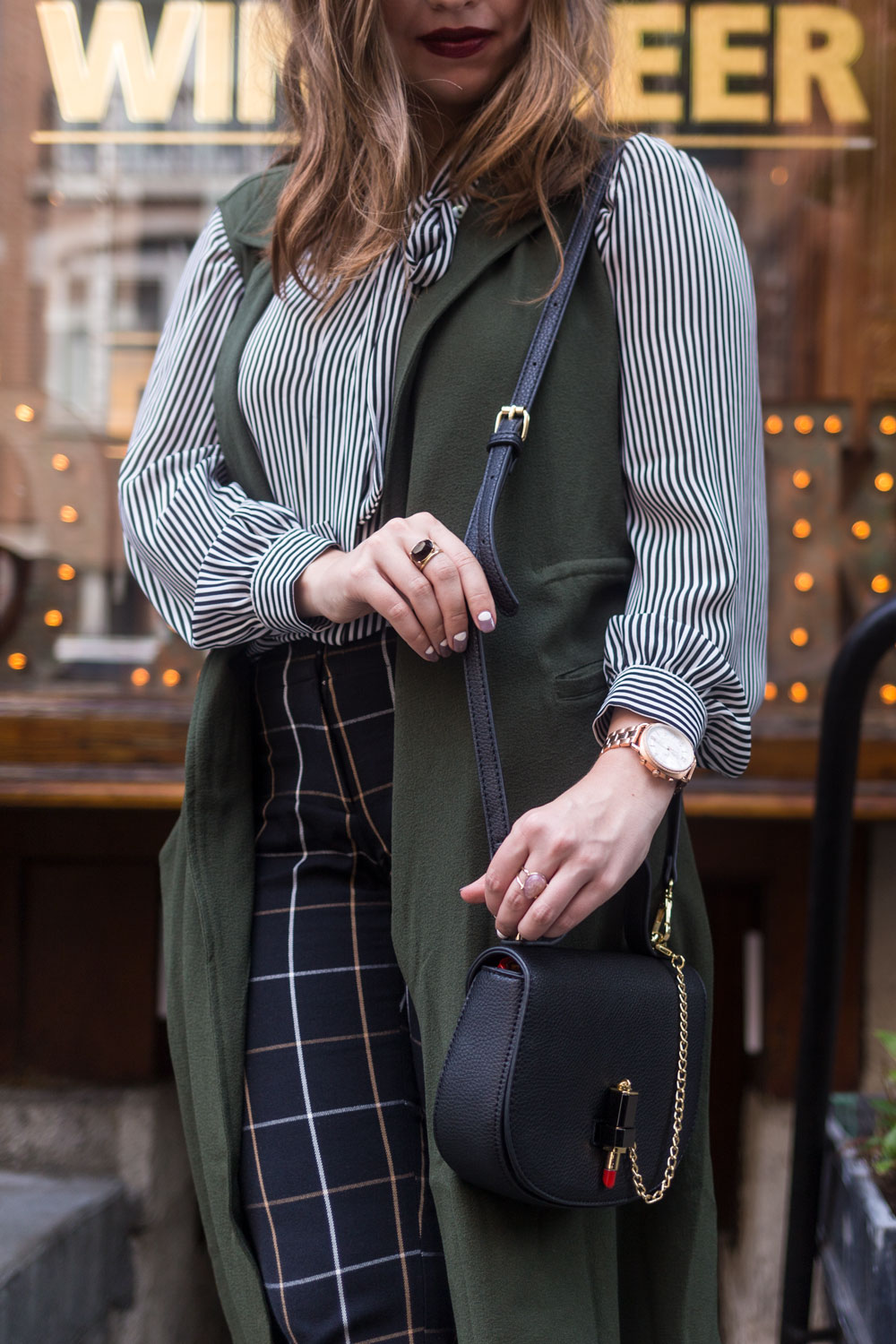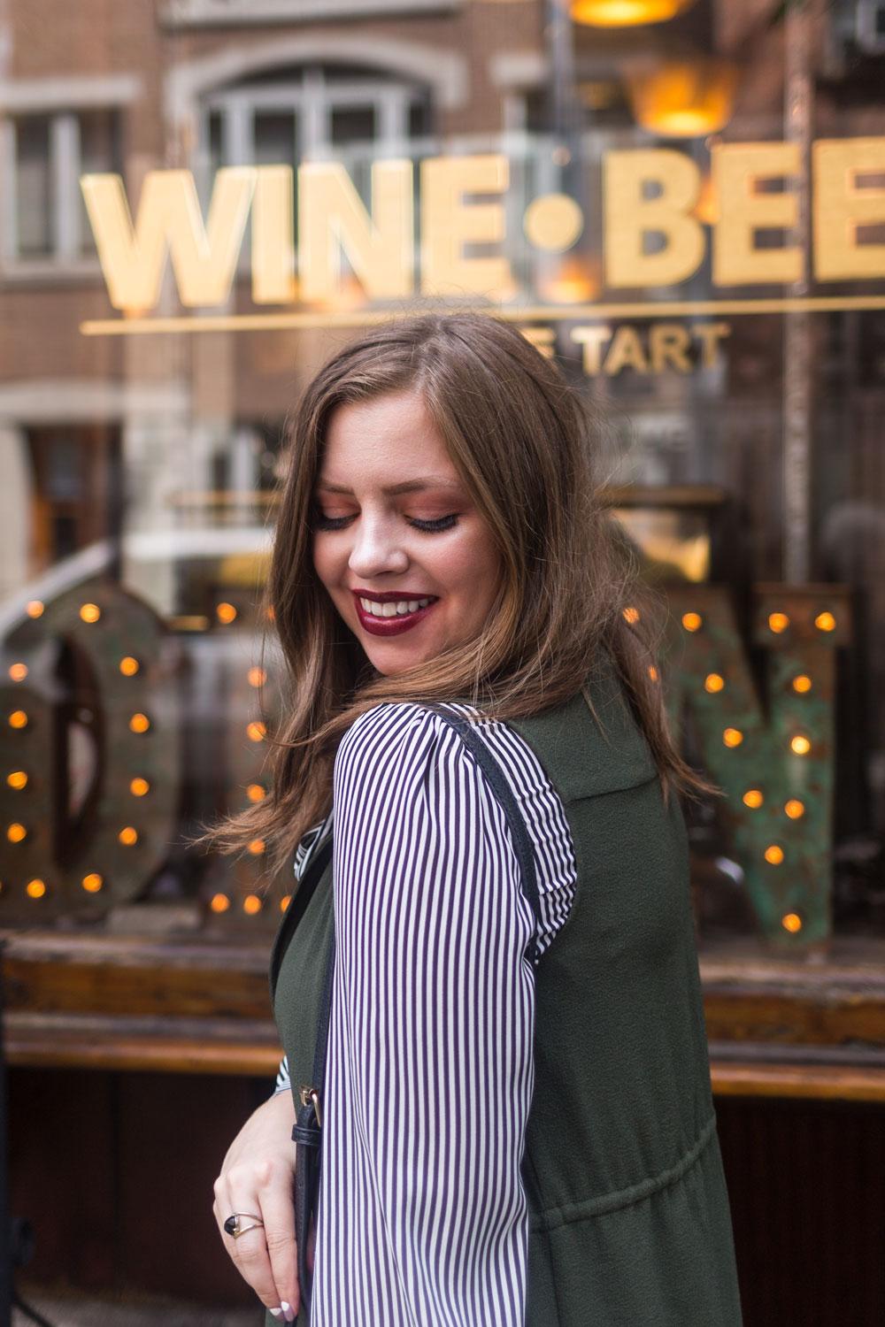 The first outfit is the one I’m highlighting today. I like to fancy myself as looking very London-esque here. Something about the small black and white stripes feels very British to me. It’s no surprise I’d want to channel some of those vibes – when we visited Europe back in Summer 2015, London felt just like home to me. It must be something about the similar climate and demeanor of the people who live there. Oh, and the food. Nothing like a little English Pub Fare to make you feel all comfy and cozy!