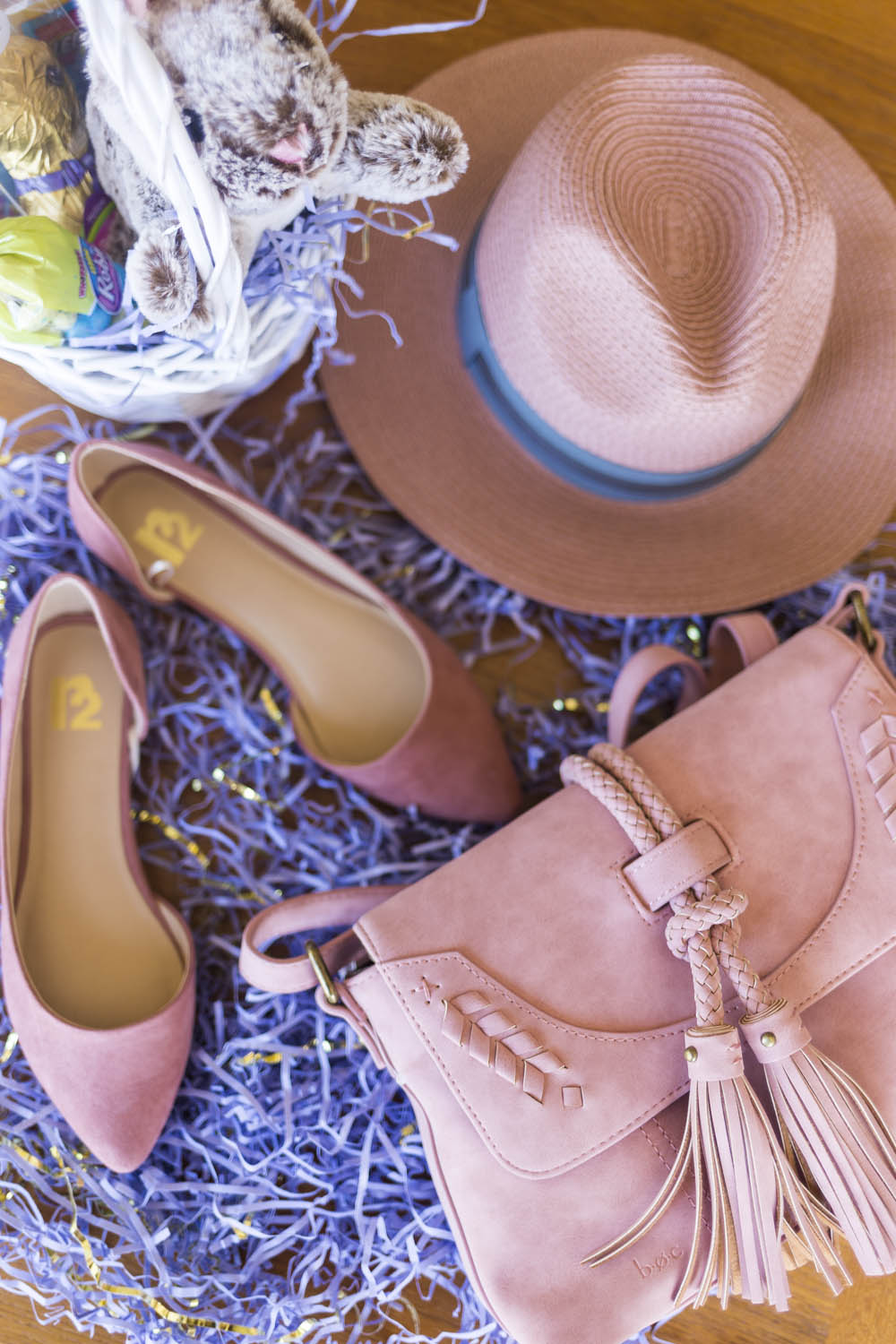 For filling Easter baskets, I opted for a casual outfit. This one features one of my favorite trends of the season: blush pink! The millennial pink tones are sticking around this spring, and that’s reflected in this gorgeous lace shift dress from Fred Meyer’s Juniors department. That’s also where I found this cute little velvet kimono to wear on top. Finally, I completed the look with a pair of R2 almond toe flats, which you’ll find on a round rack in the shoe department or on the wall as you enter the shoe department. (They also have cute sandals and sneakers here, too!) I also added a BOC shoulder bag and David and Young hat, also in blush tones, from the accessories department.