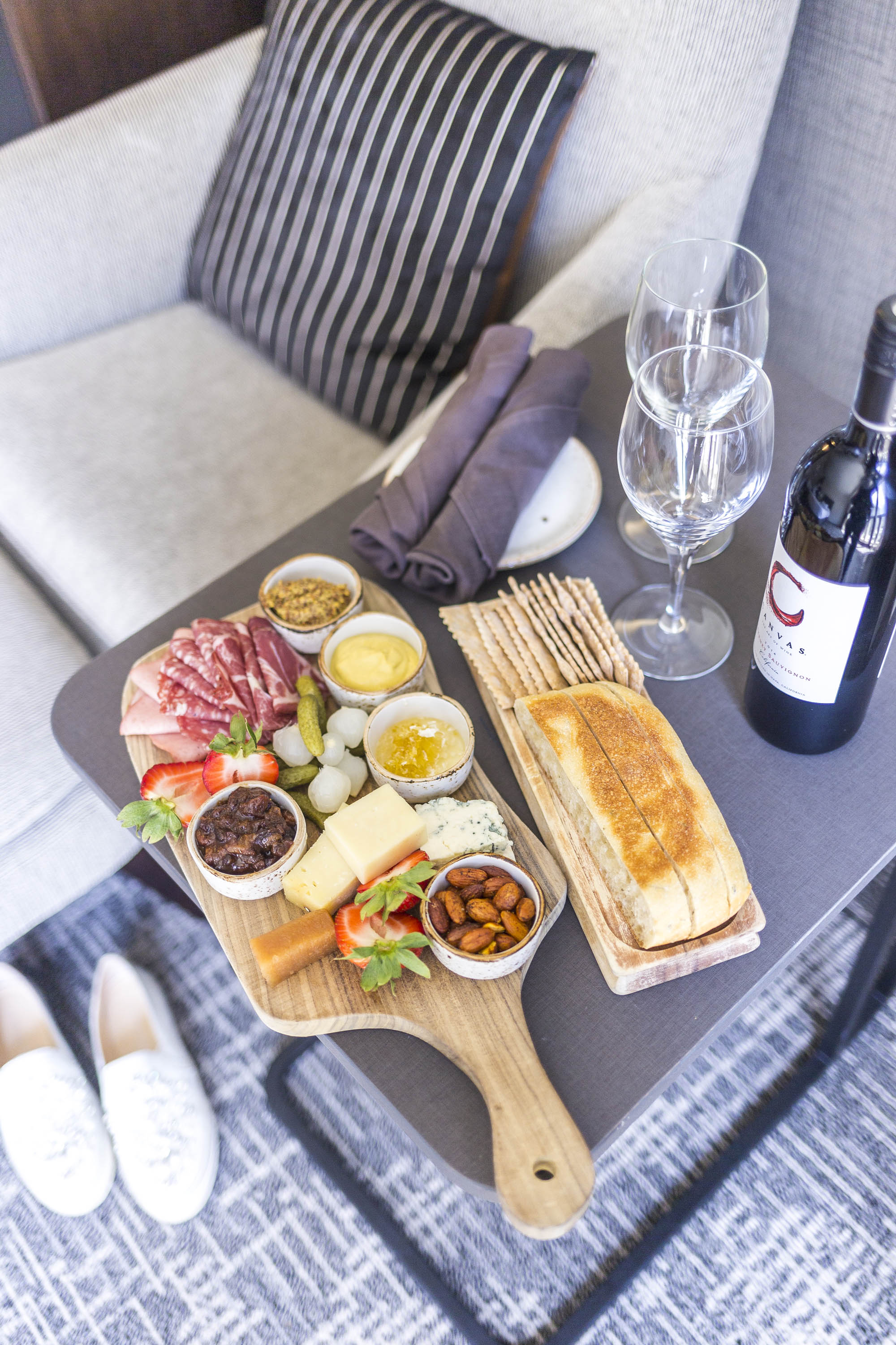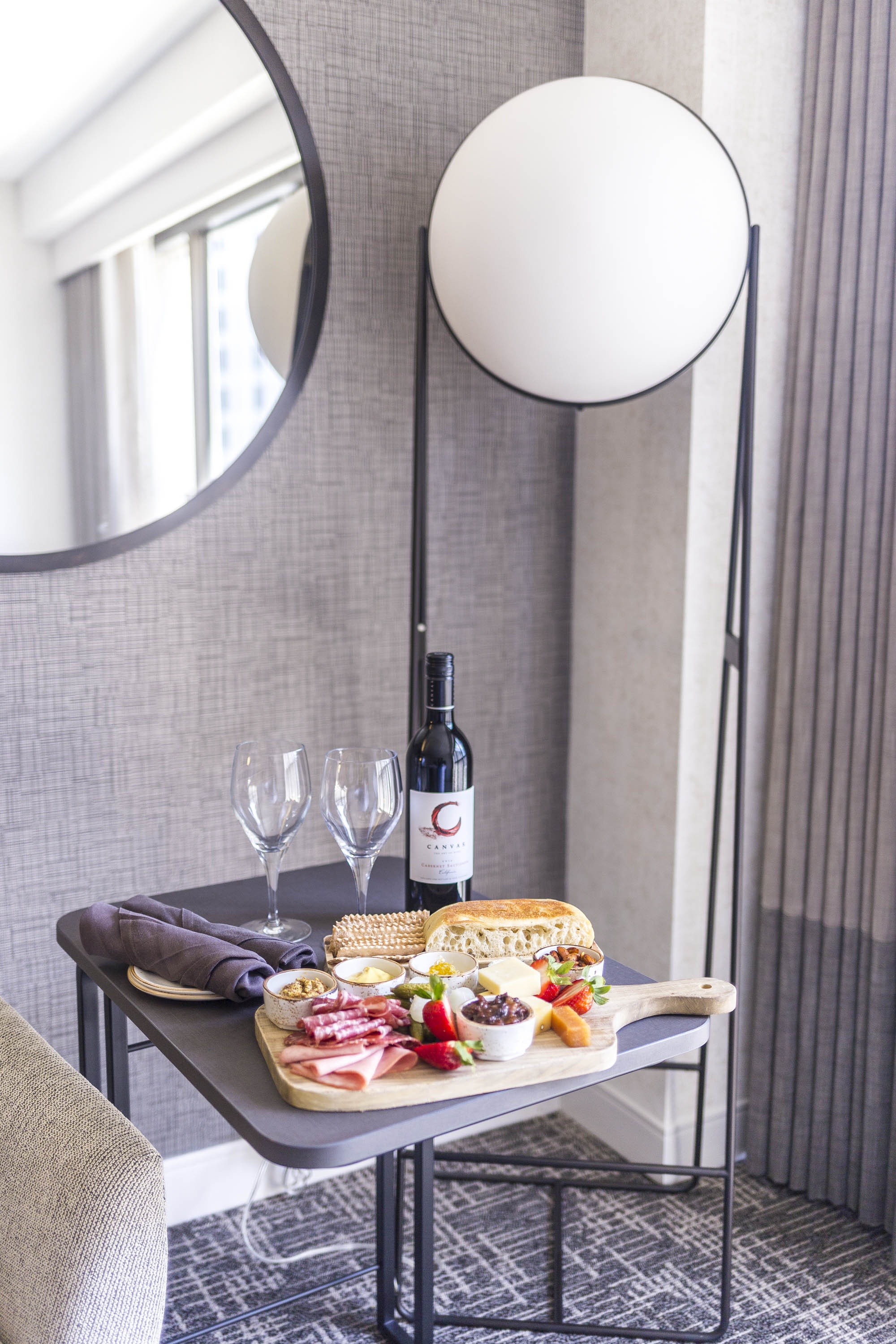 Once upstairs, we were welcomed to the upscale and generous sized room (for a big city like San Francisco, I was expecting tight quarters!) with views of the city and modern decor. The bathroom was generous, with a huge mirror (perfect for getting ready in!) and a large glass shower. Also waiting for us was a cheese plate and glass of wine. Only fitting on National Cheese Day!