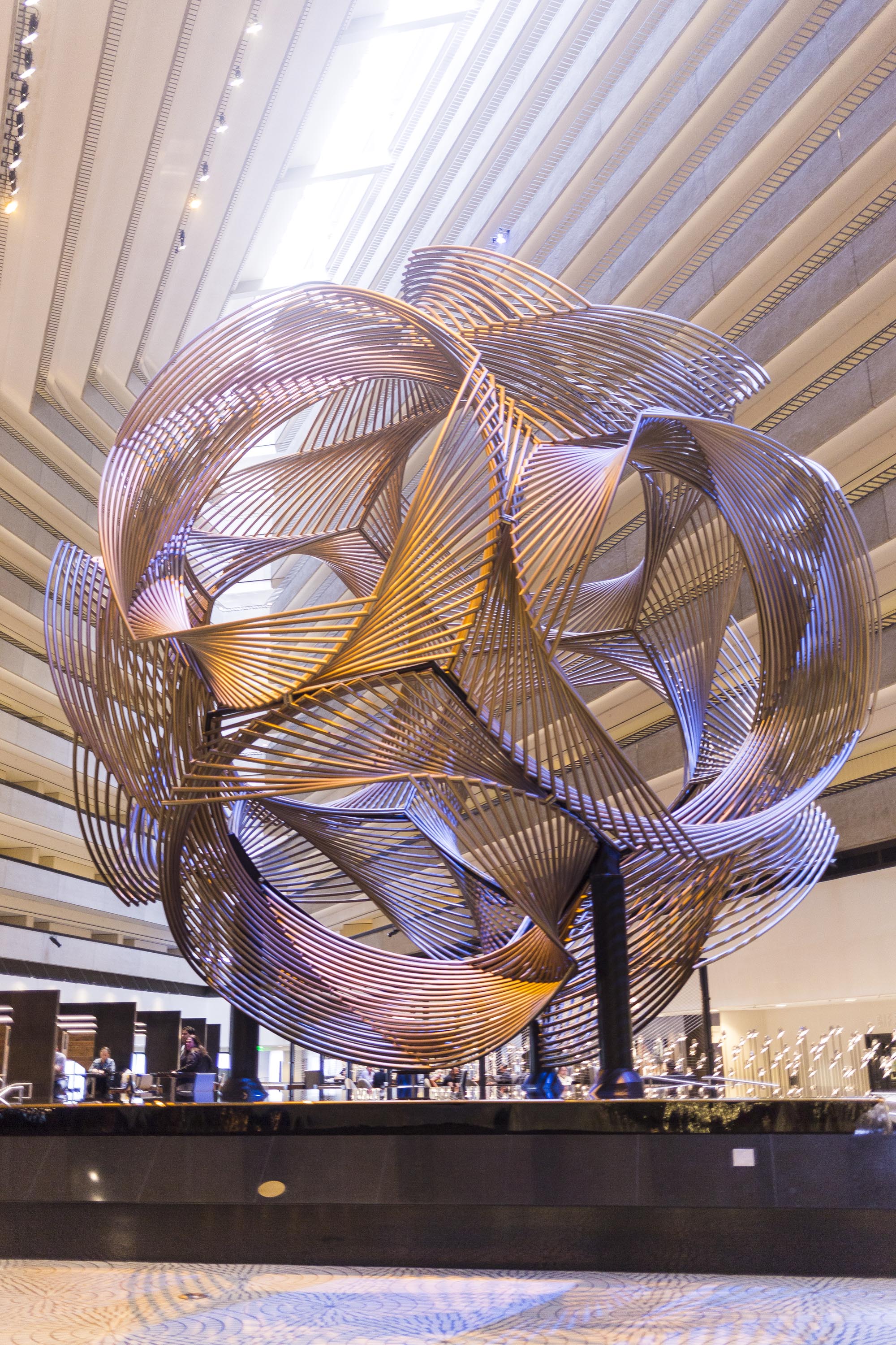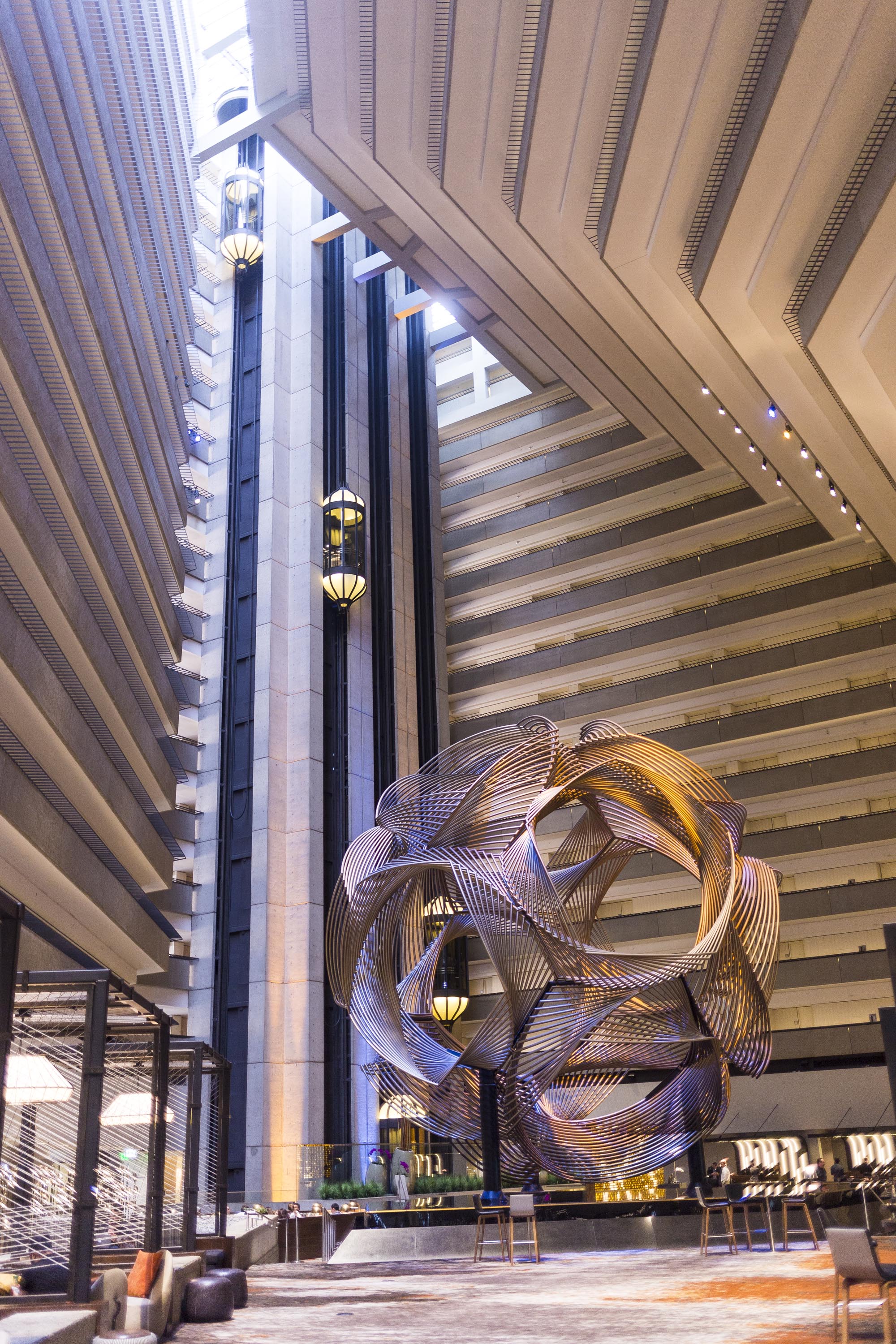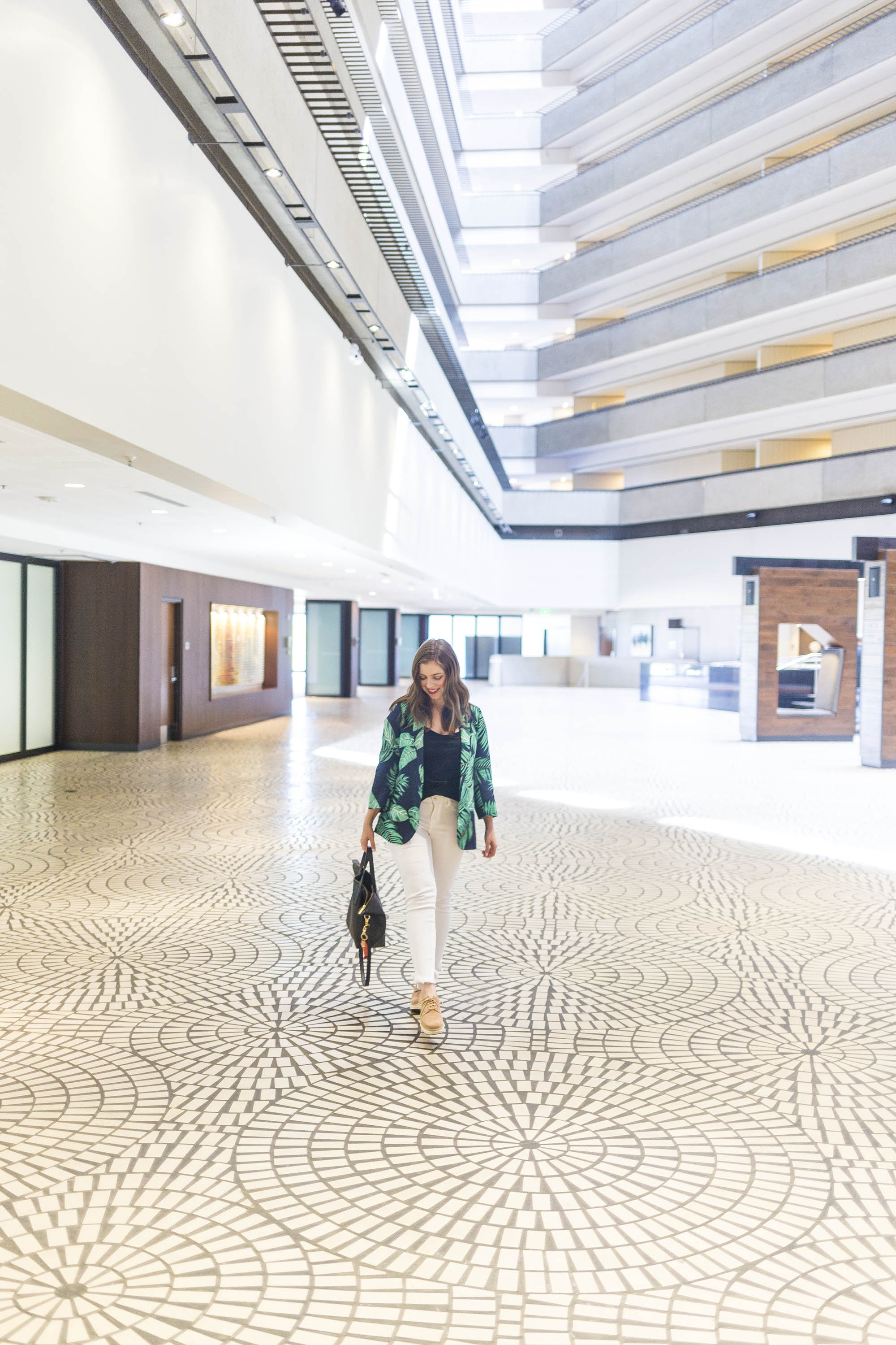 Upon walking into the Hyatt Regency Hotel Lobby, I was greeted with the highest ceilings I think I’ve seen, Art Deco style tile flooring, interesting sculptures, and the coolest glass elevators. Check in was a breeze, and I was quickly heading up to my room, but not before stepping outside to see the back hotel gardens and a beautiful view of the Ferry Terminal.
